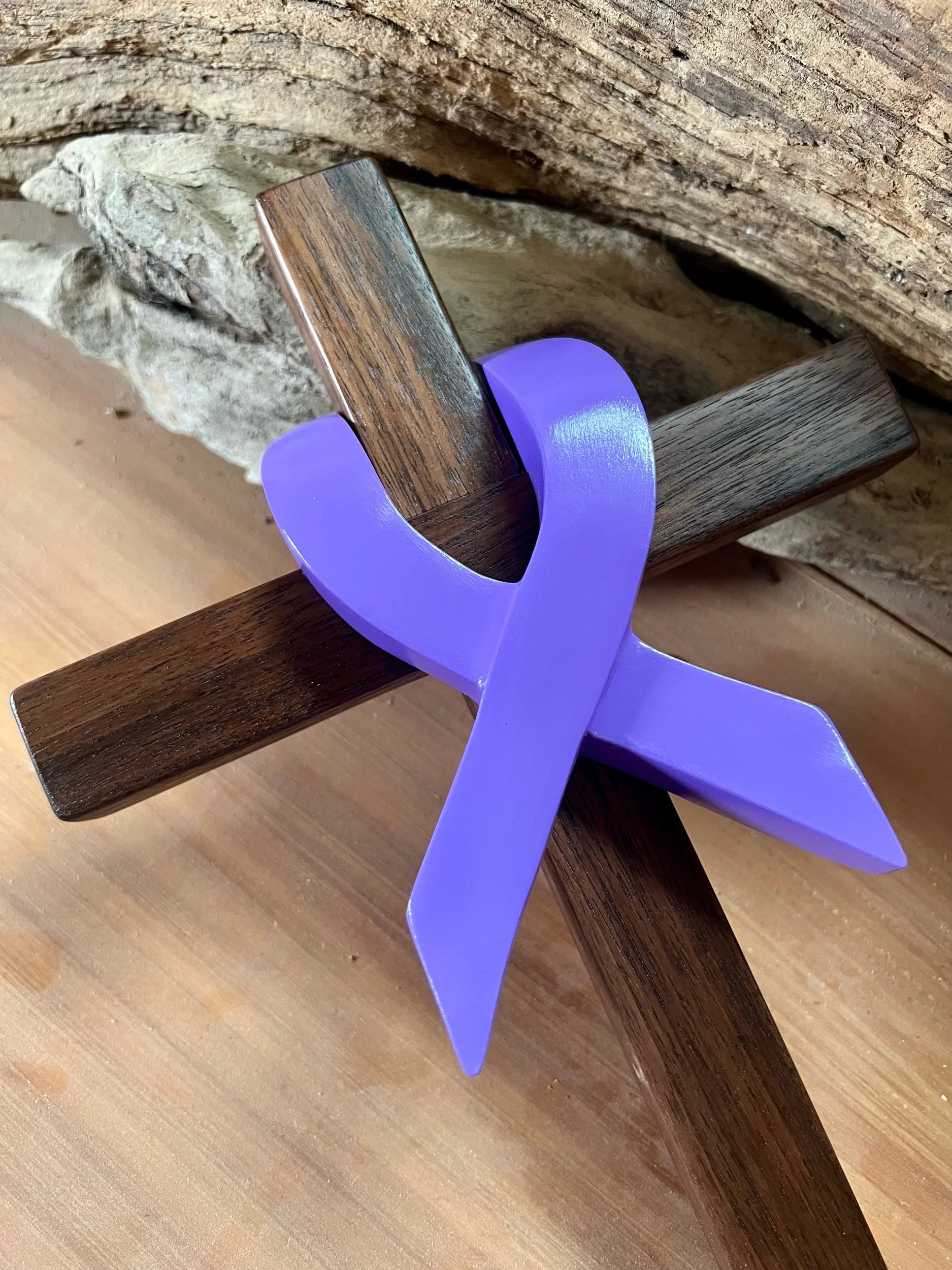 The crosses are Solid Walnut or Solid Ash. The ribbon is made entirely of Fir or white Pine. It takes multiple cuts and carving to get this shape. It is sealed, painted and then finished to a beautiful Semigloss sheen. The ribbon is finished in all water based finishes to reduce the off-gassing of chemicals.
