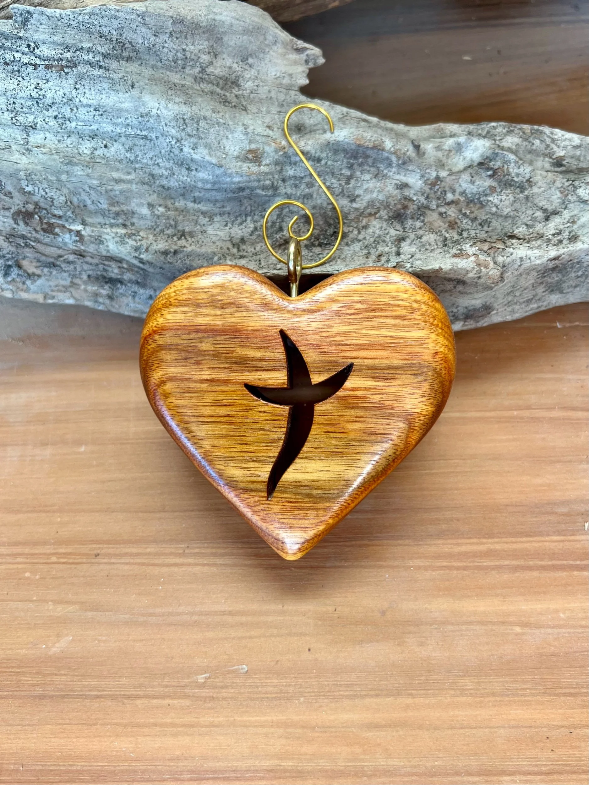 The Cross is scrolled out. The cross is sanded from 180 grit to 320. The finish is a natural blend of Waxes and Polymers that are hand applied and buffed to a smooth sheen through a 7 step process.