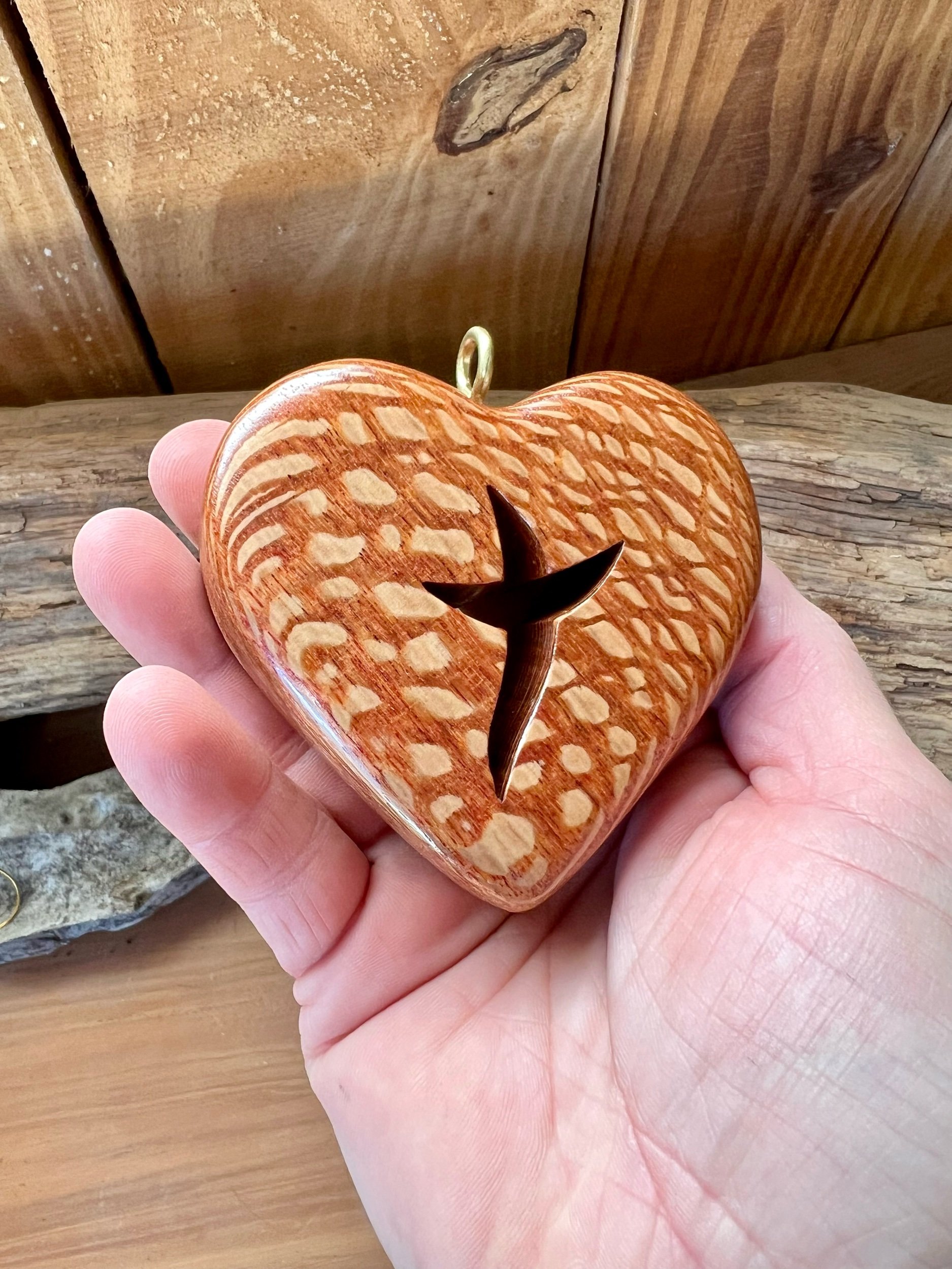 The Cross is scrolled out. The cross is sanded from 180 grit to 320. The finish is a natural blend of Waxes and Polymers that are hand applied and buffed to a smooth sheen through a 7 step process.