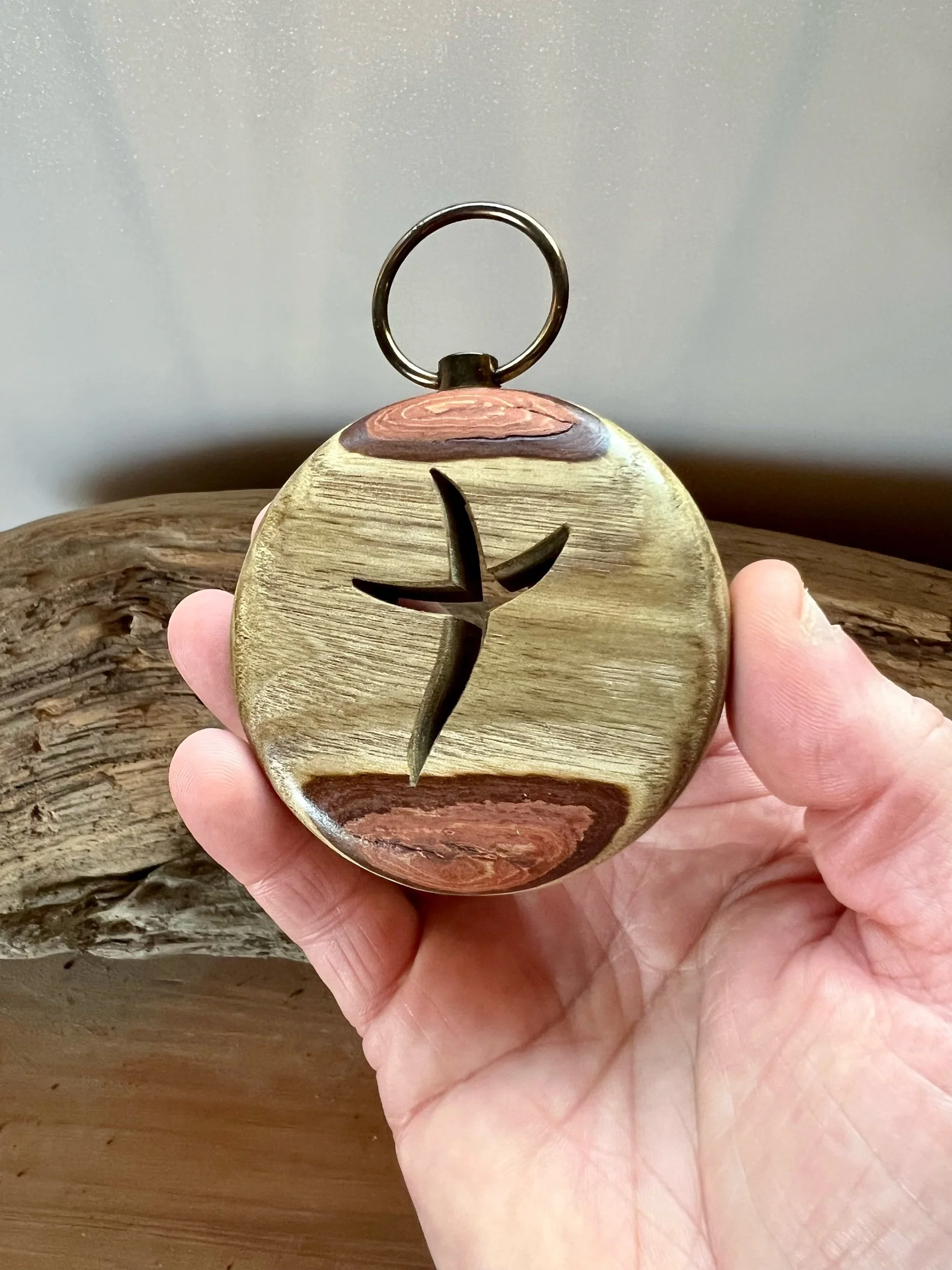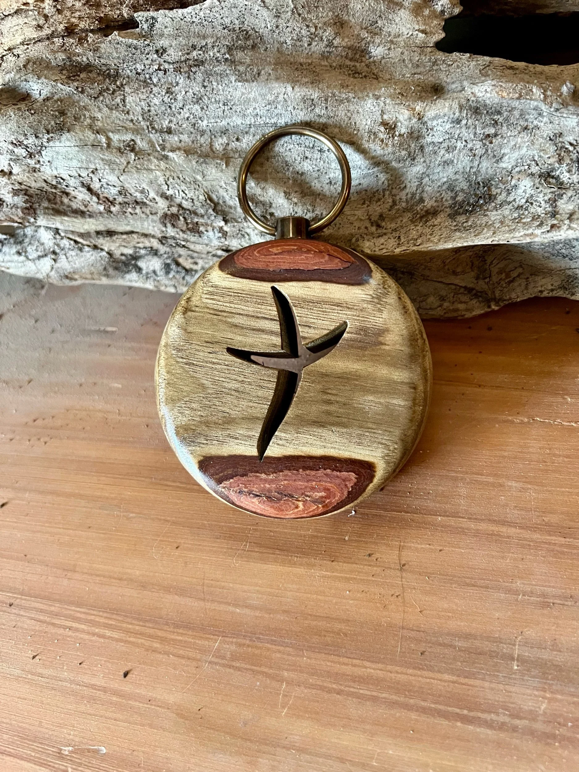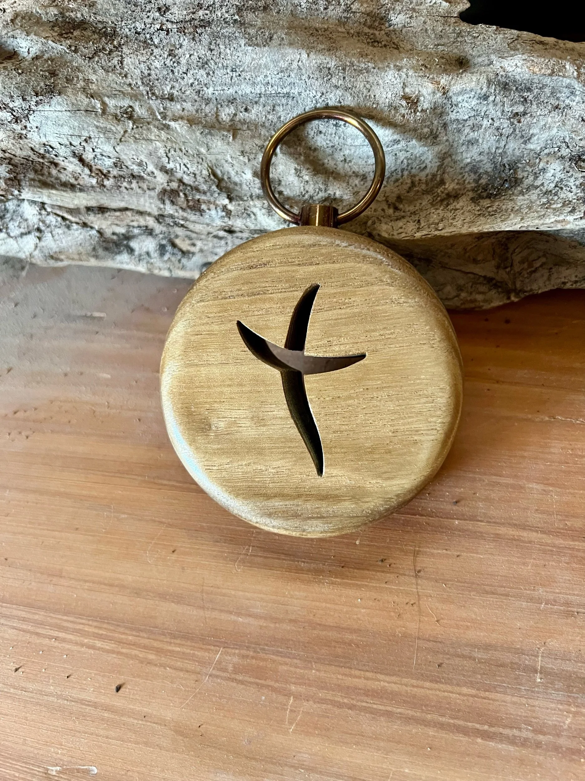 The cross is scrolled out and it is sanded to 320 grit. The finish is a three part consisting of a penetrating oil, sanding sealer, and a final coat of lacquer. It is then hand burnished to a soft velvet feel. The hanger is heat treated to a desired color to accentuate the wood.