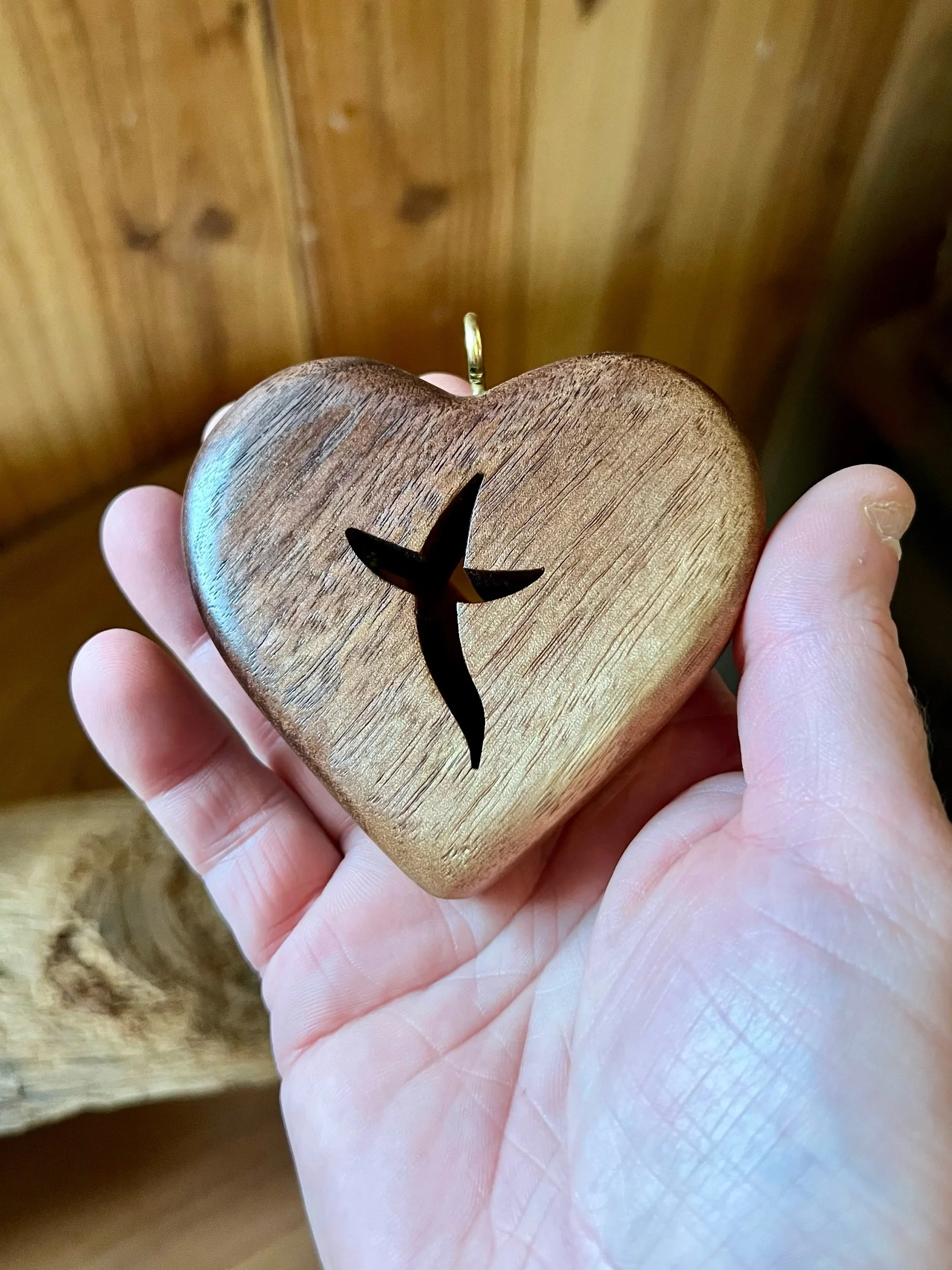 The Cross is scrolled out. The cross is sanded from 180 grit to 320. The finish is a natural blend of Waxes and Polymers that are hand applied and buffed to a smooth sheen through a 7 step process.