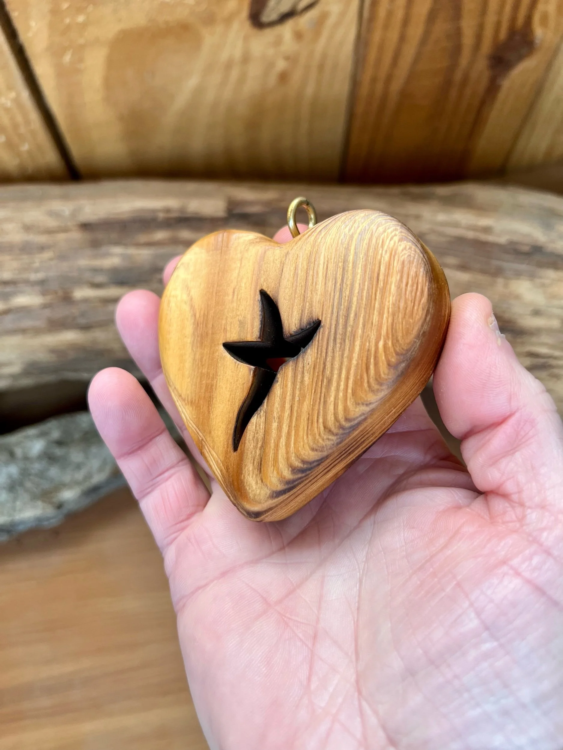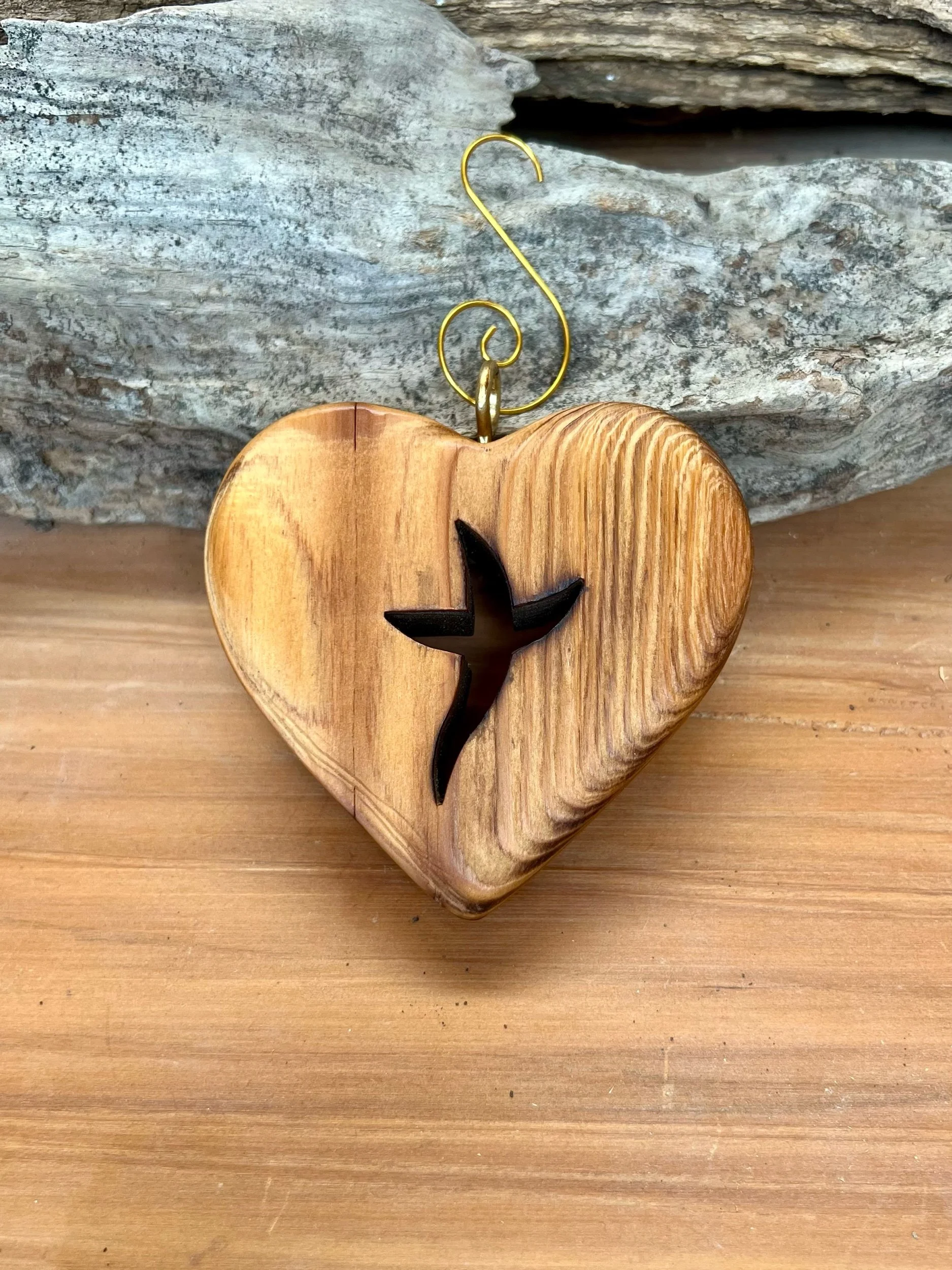 The Cross is scrolled out. The cross is sanded from 180 grit to 320. The finish is a natural blend of Waxes and Polymers that are hand applied and buffed to a smooth sheen through a 7 step process.