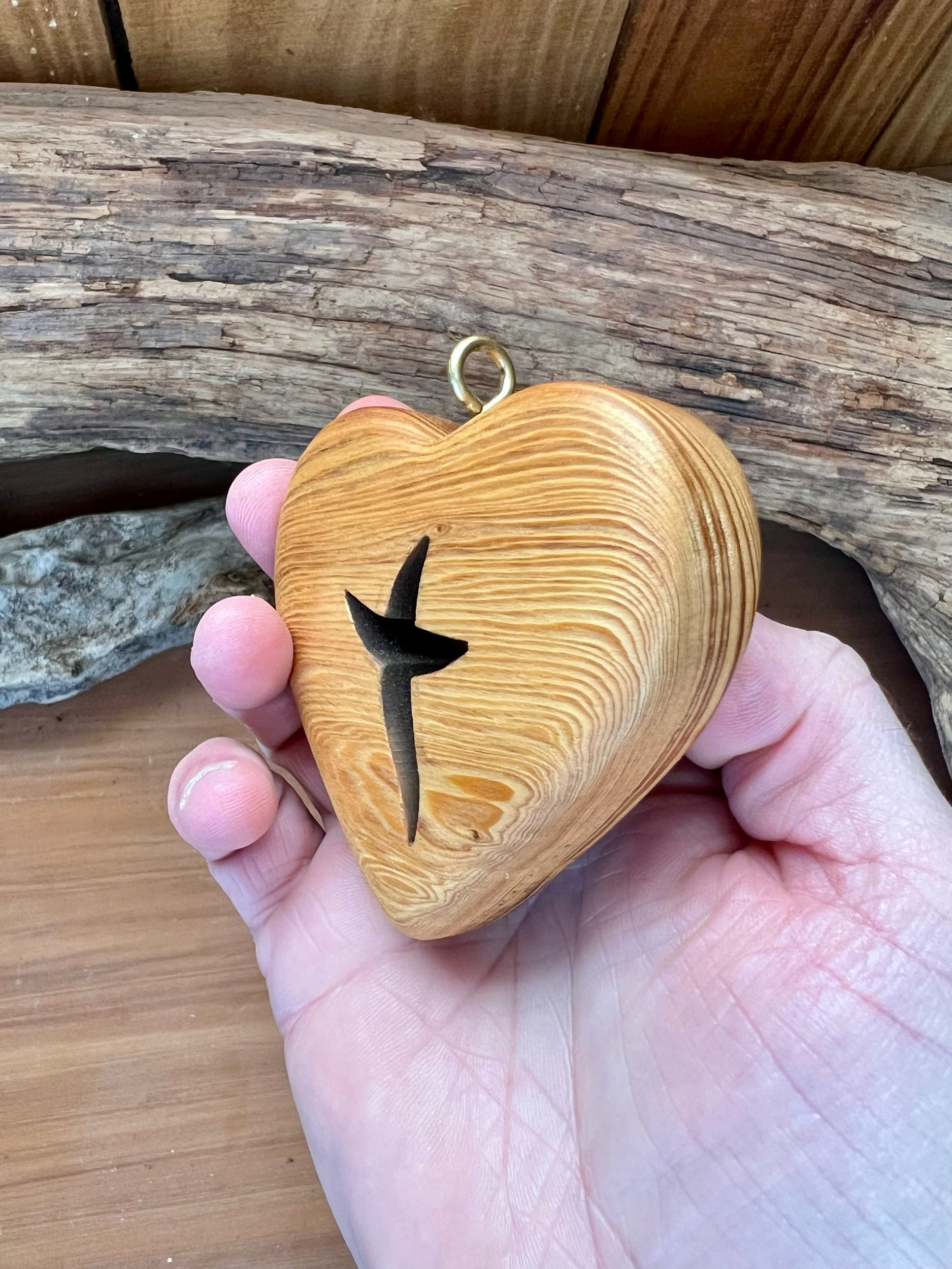 The Cross is scrolled out. The cross is sanded from 180 grit to 320. The finish is a natural blend of Waxes and Polymers that are hand applied and buffed to a smooth sheen through a 7 step process.