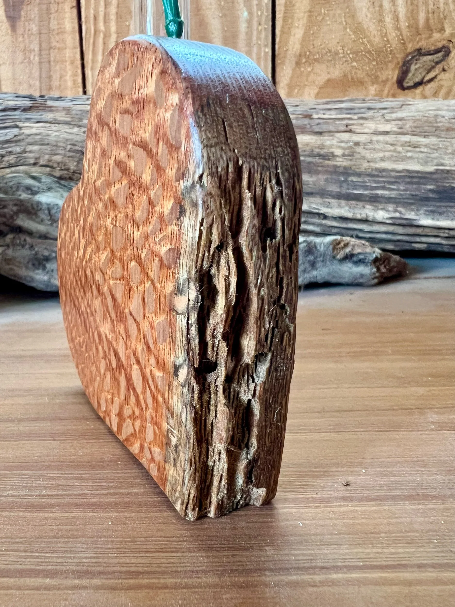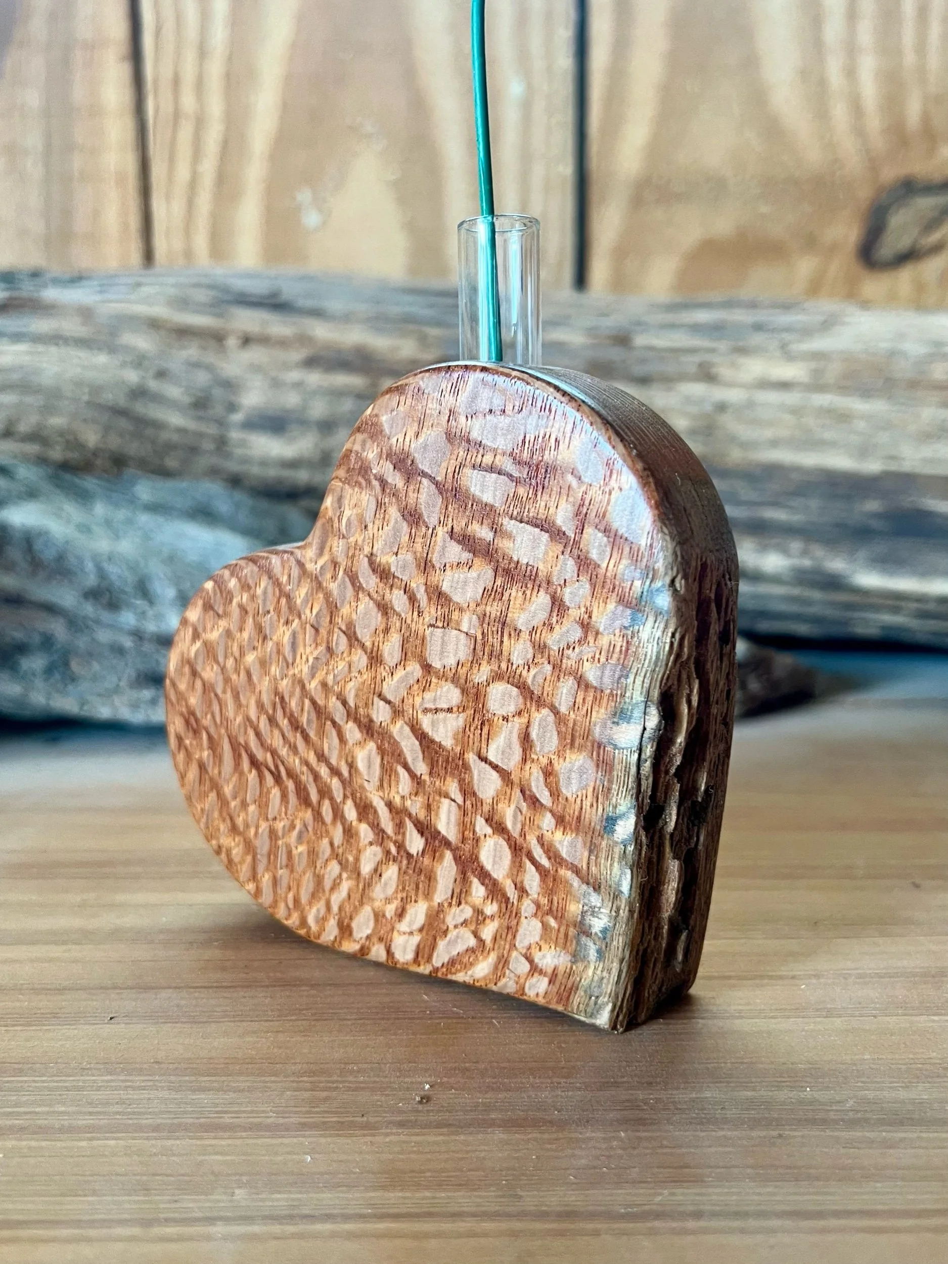 Solid live edge Lacewood 4x4 with small glass bud vase.