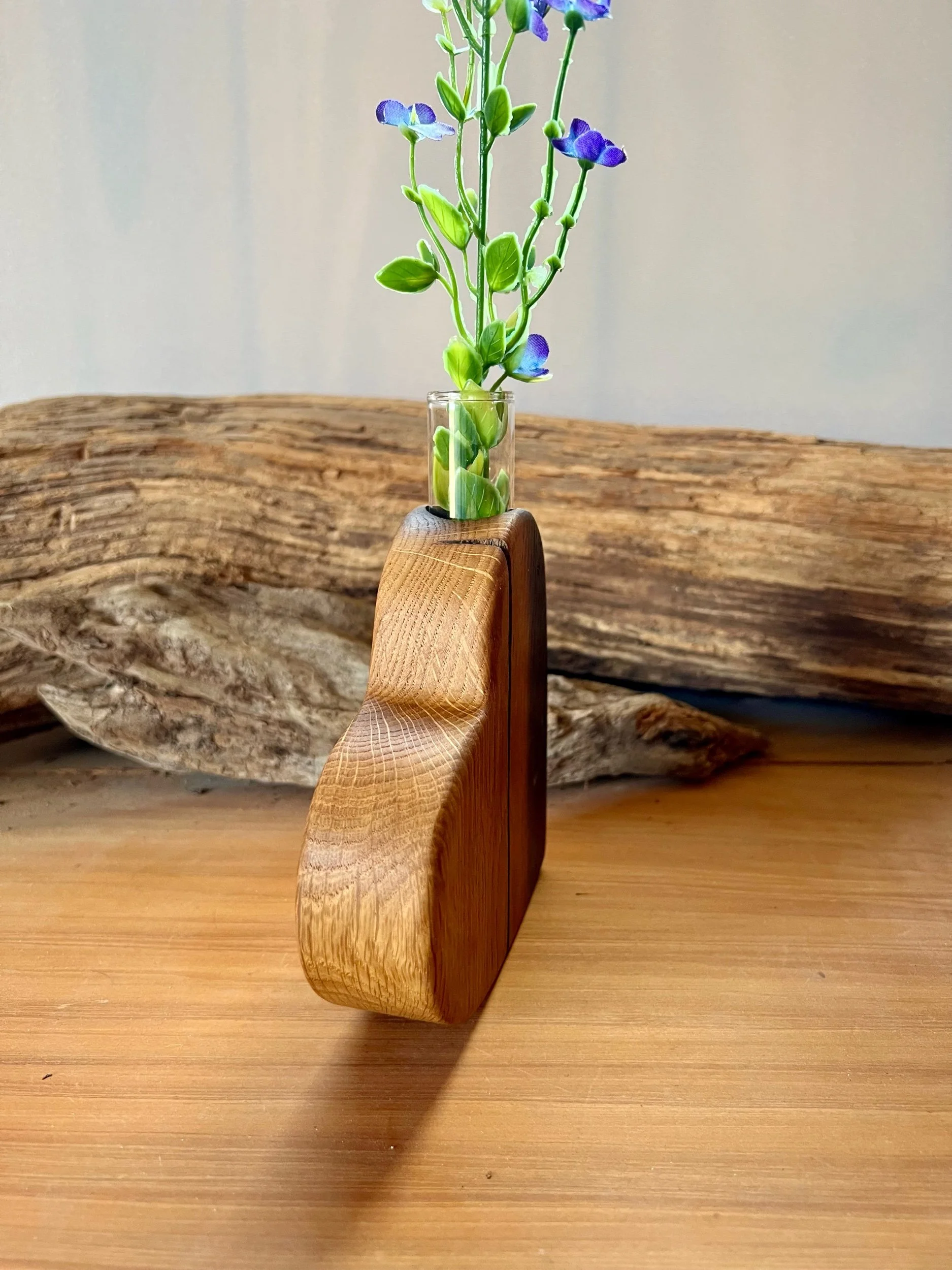 This one has the larger sized glass bud vase that can be removed when desired. It was sanded to 320 grit and left with all of its beauty as it was found. Finish is multiple coats of hand rubbed Ollie’s Oil over a week’s time. Smooth to the touch.