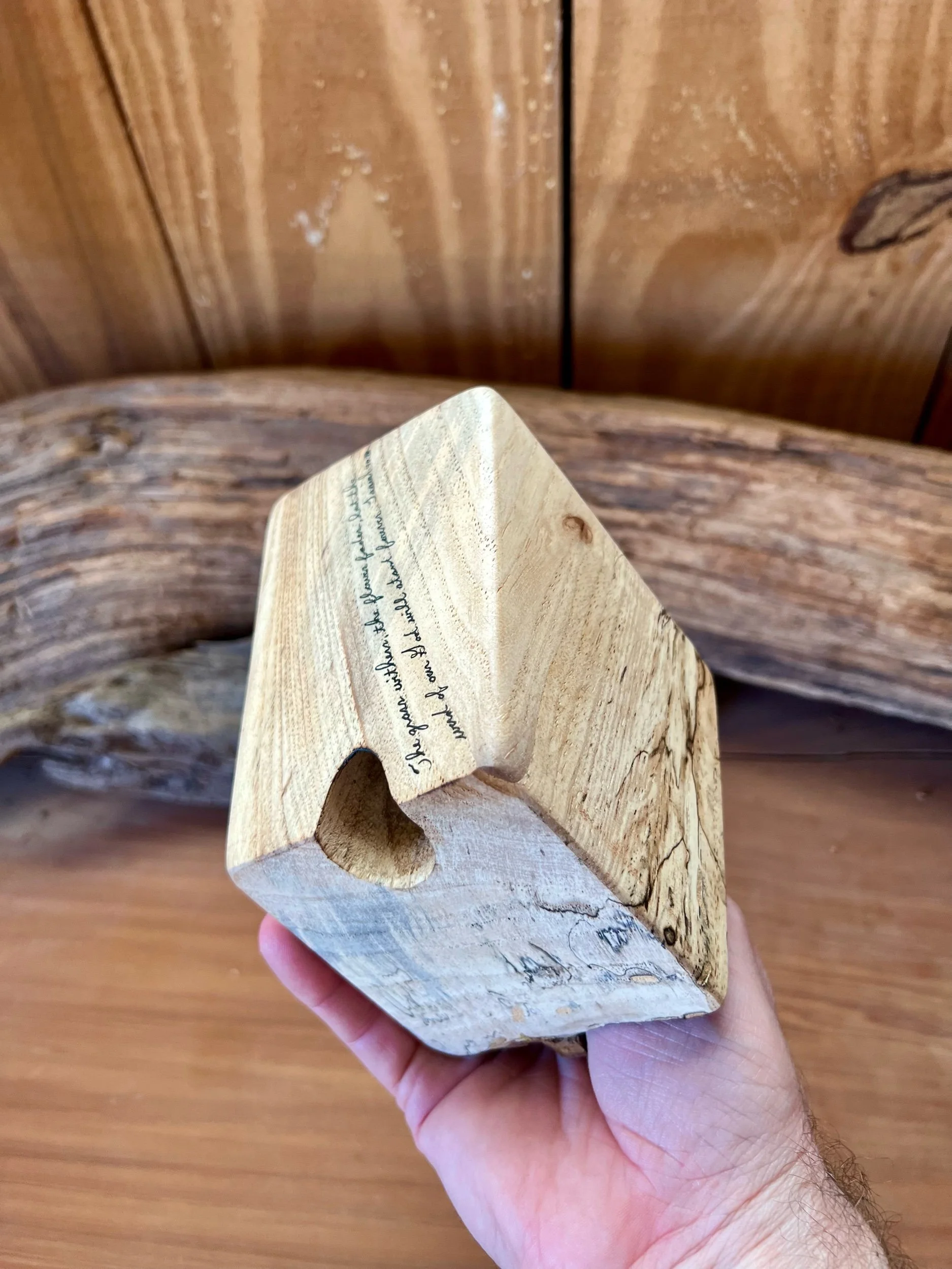 Made of a solid little cut off chunk of Spalted Ash. It has a 20 degree angle. Sanded to 320 grit and Finished by hand with waxes and oils to a satin finish.