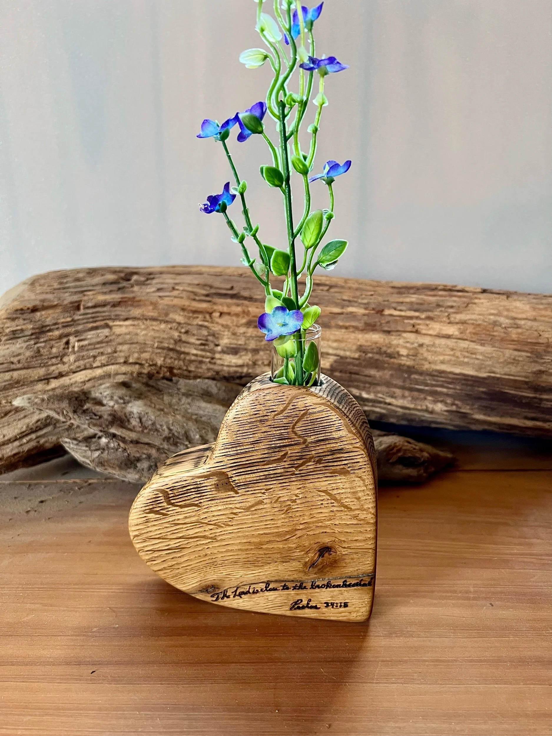 This one has the larger sized glass bud vase that can be removed when desired. It was sanded to 320 grit and left with all of its beauty as it was found. Finish is multiple coats of hand rubbed Ollie’s Oil over a week’s time. Smooth to the touch.