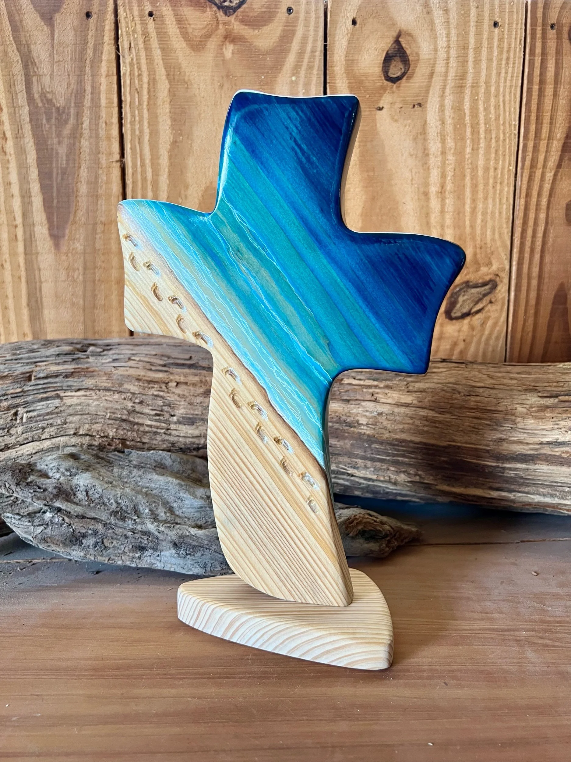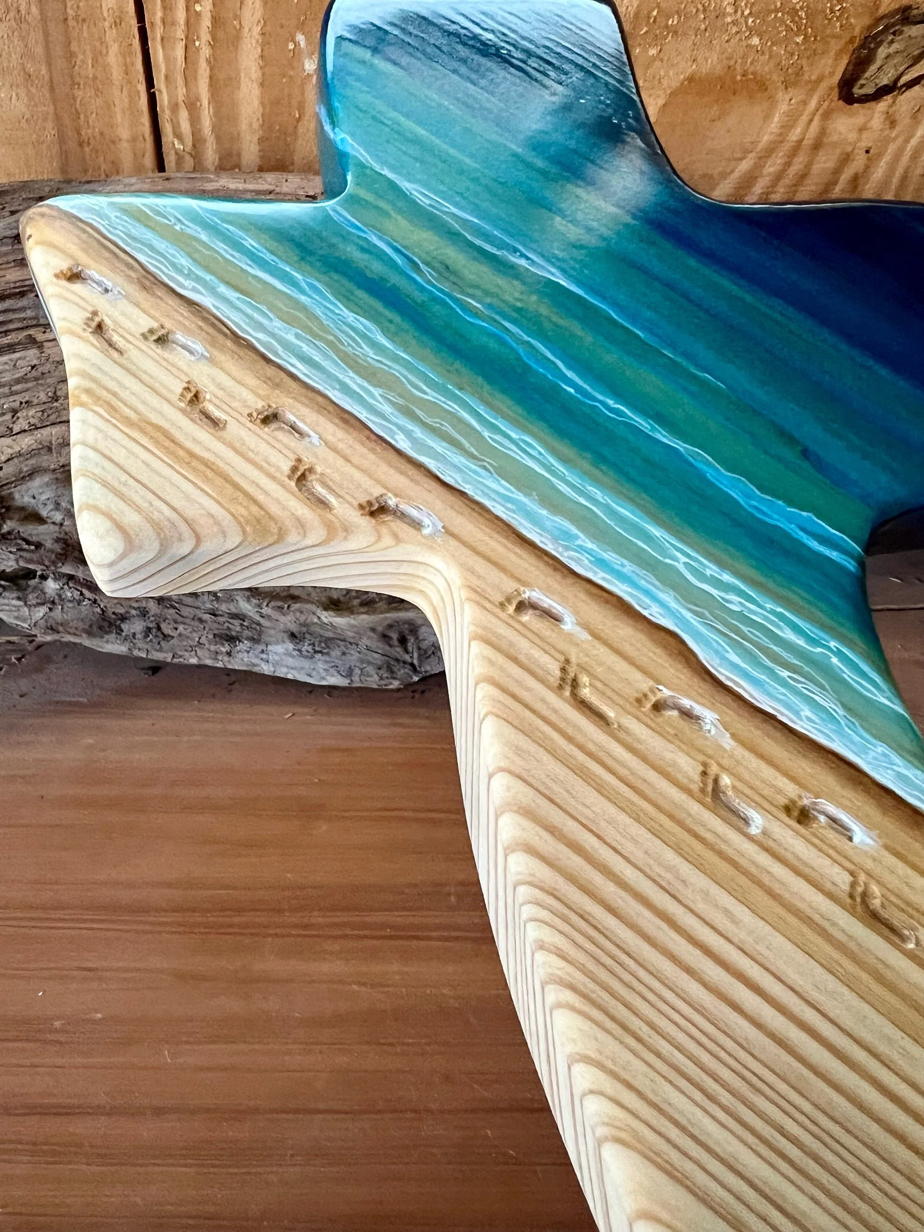 The footprints are engraved into the wood. The colors are hand painted with water colors. We use only rainwater that God provides to mix with the colors. We have followed the grain of the wood God designed with the paints. The water portion is finished to a gloss. The back is signed and dated with the limited number and also the verse reference Matthew 11:28