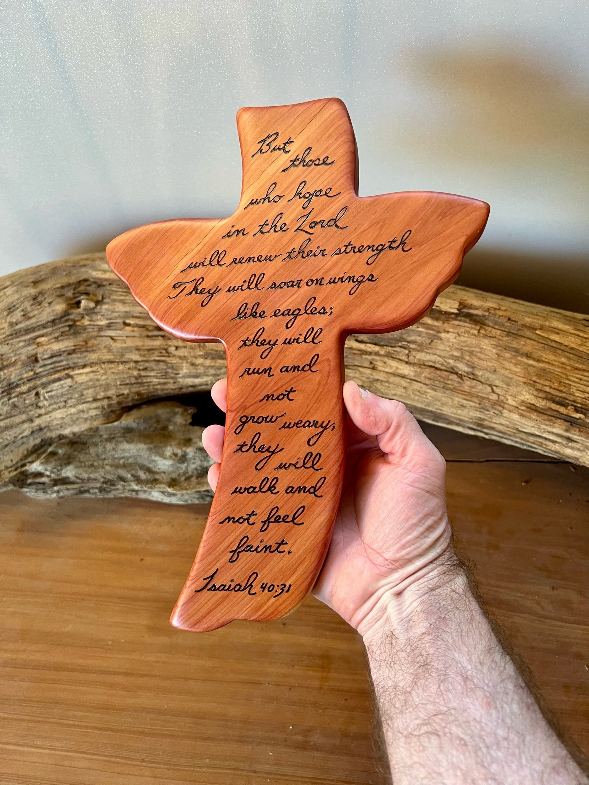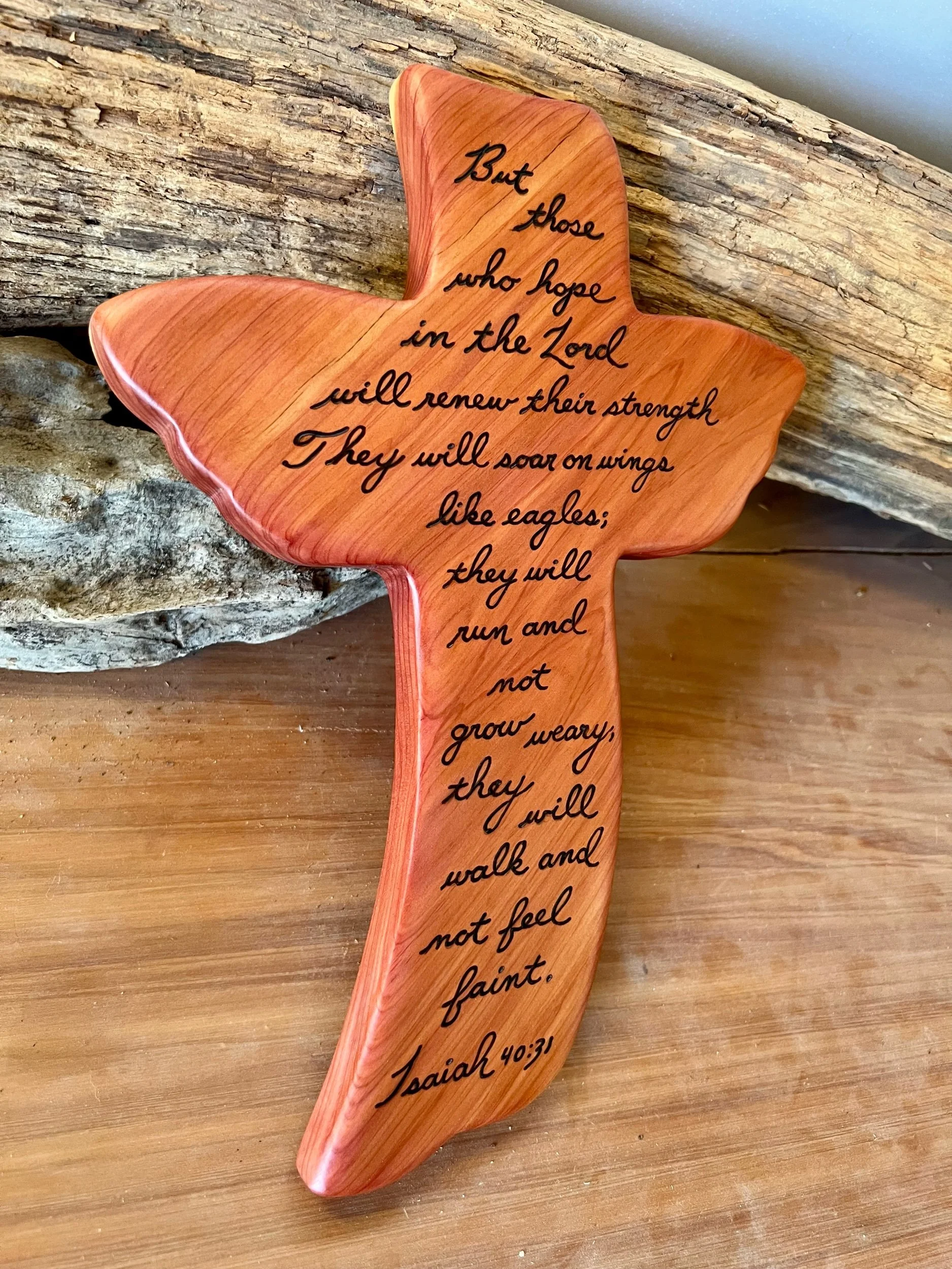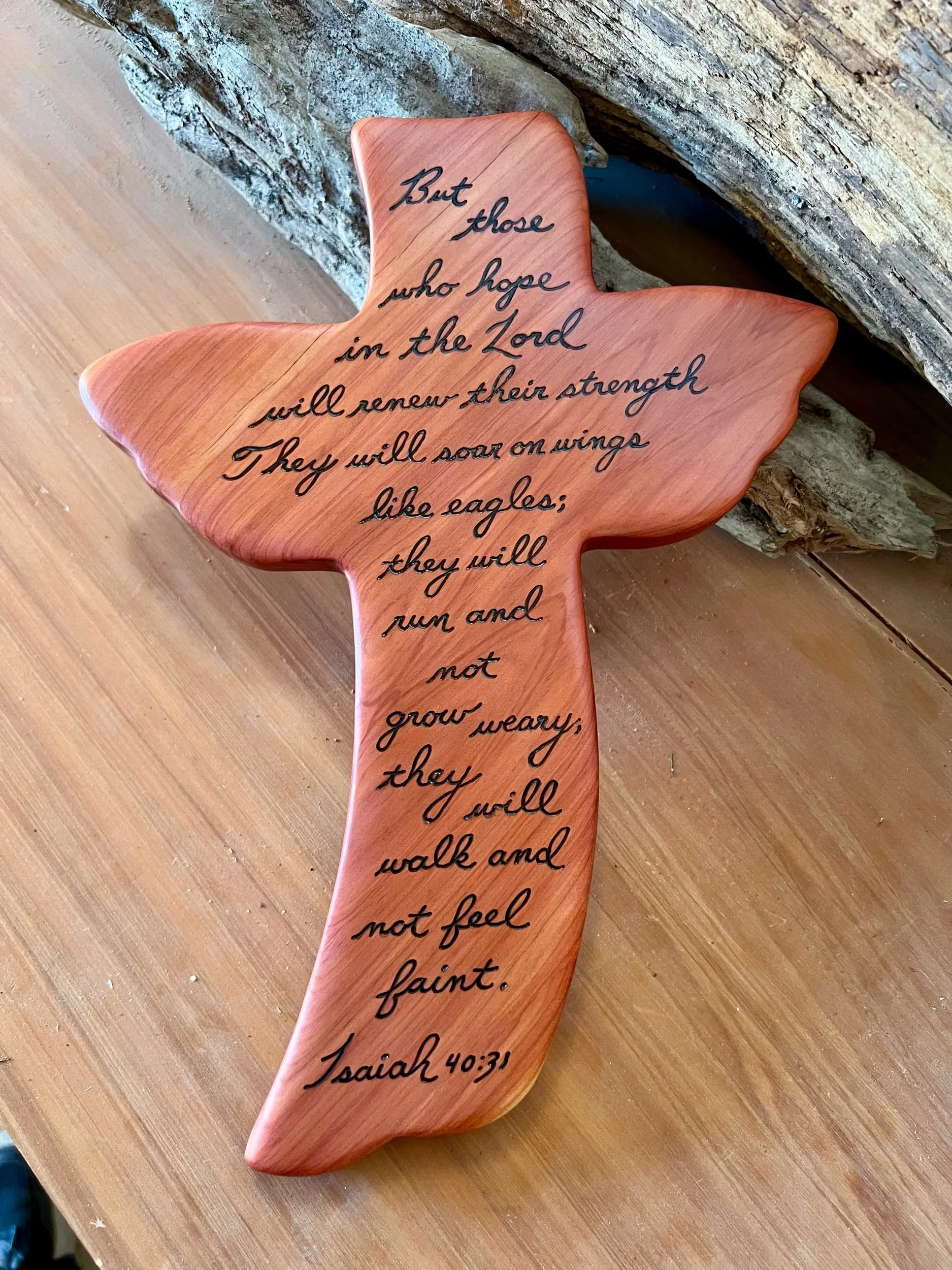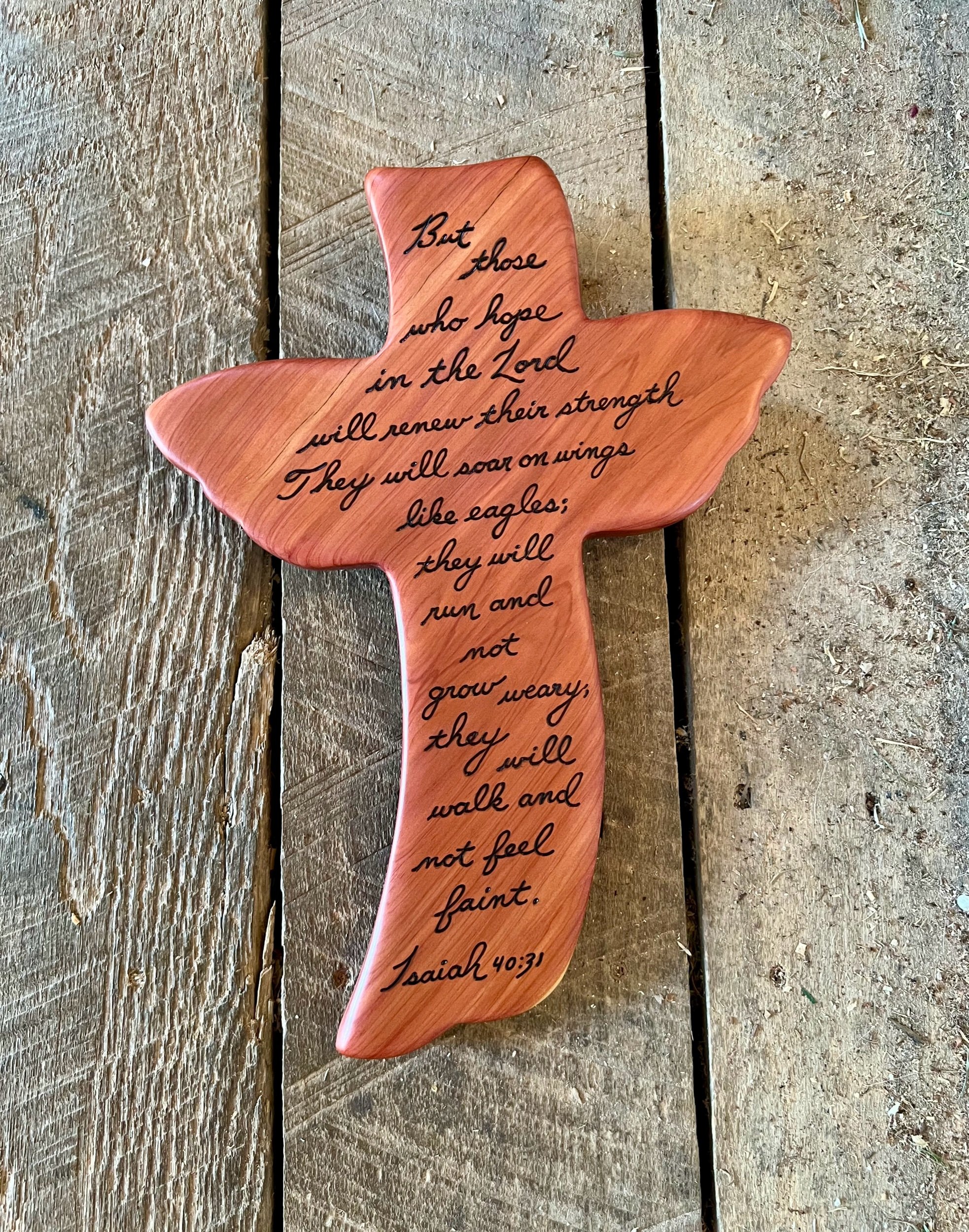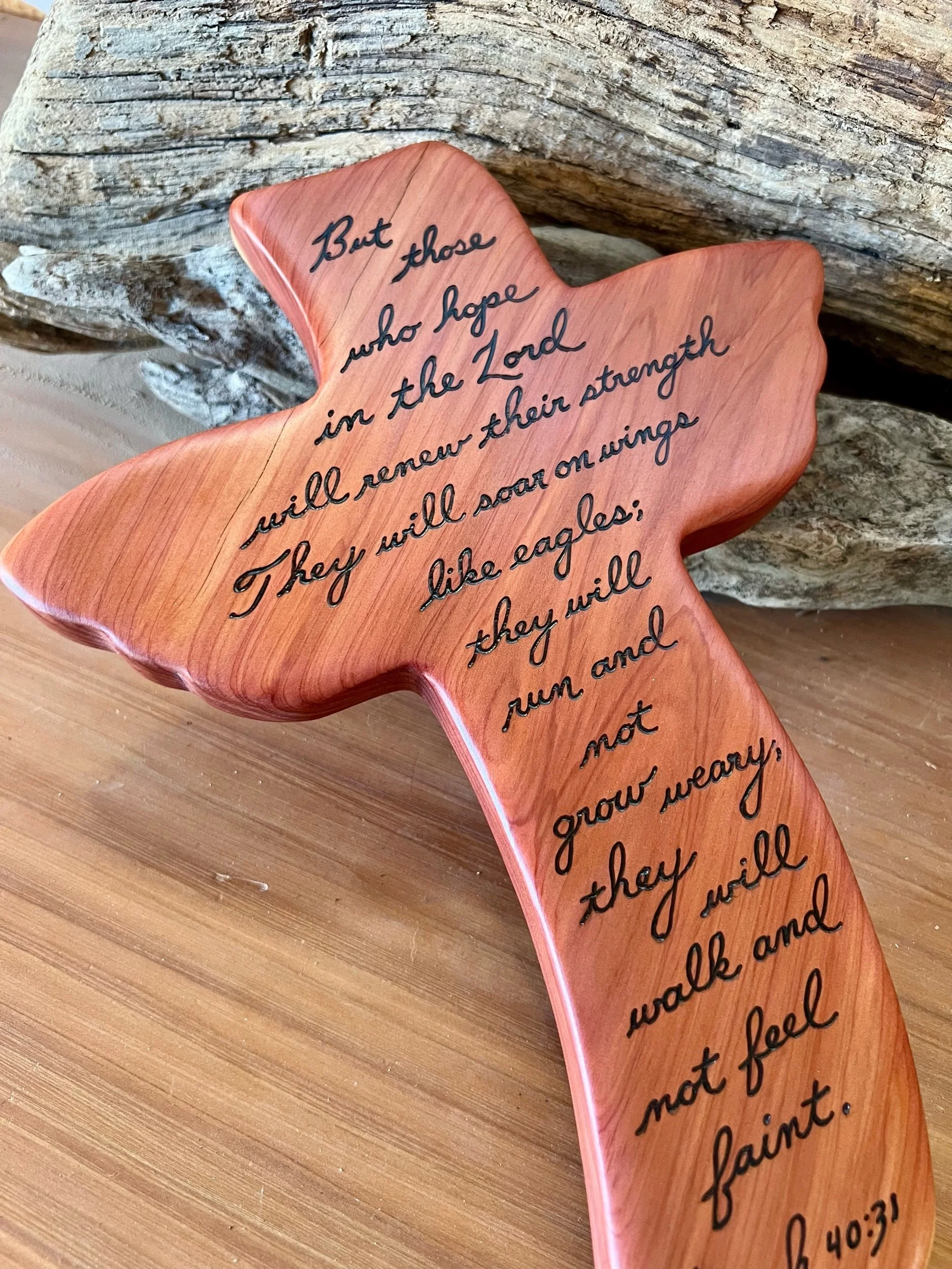 Welcome to the Divine Crosses Scripture Crosses Page. Here, you can discover the unique crosses that we create specifically to order for our valued customers. The Bible is a timeless book, rich with verses that are ready to be beautifully engraved for display in your home or office space. If you have a favorite verse that you would like to see represented on a cross, please feel free to email me, and I will gladly check if it fits within our design templates. We genuinely enjoy the process of engraving these meaningful verses while also praying for the recipient and their special connection to the scripture.